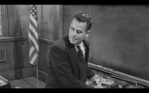 At the point of almost giving up on his surly working class, ethnic, inner-city students to seek a cushy job in the segregated suburbs, Dadier brings in the reel-to-reel as a Hail Mary attempt to quell his students’ noise and remake them into good Cold War citizens once and for all. As he tells them, “We all talk, but nobody listens.” From the moment he enters the classroom, the students continue to defy the white male authority embodied in Dadier and housed in his machine—“Did you bring your cosmetics to school, Chief?” taunts one student (Gregory Miller, played by Sydney Poitier)—and they undermine his assignment by selecting the “noisiest” student in the class to make a recording: Puerto Rican Student Pete Morales. As I have discussed on this blog and in print, the concept of “noise” has a racialized edge, particularly in the 1950s, when Cold War cosmologies of colorblindness and “enemies within” ruled the day. Sound was an efficient way to separate “Us” from “them”—the noisy dissident from the quiet citizen—without making explicit reference to visual markers of race. And, let me tell you, Morales’s obscene, heavily-accented speech—peppered with “stinkin’”s, 14 of them in total—really makes Dadier’s spools spin. To hear more on the tape recorder in 1950’s American life and this film, see my essay “Reproducing U.S. Citizenship in a Blackboard Jungle: Race, Cold War Liberalism and the Tape Recorder” forthcoming in the American Quarterly special issue on sound (September 2011).