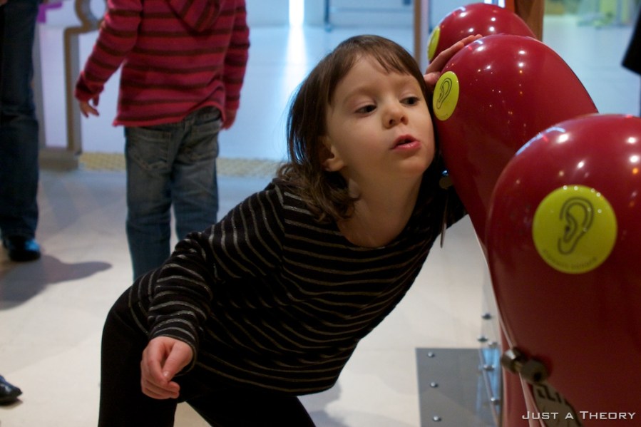 CiteÌ des enfants has a section for sensory perception. You spin a roulette wheel that shows a picture and, in the listening case, you listen to each of the posts to determine which one makes the sound represented by the picture.