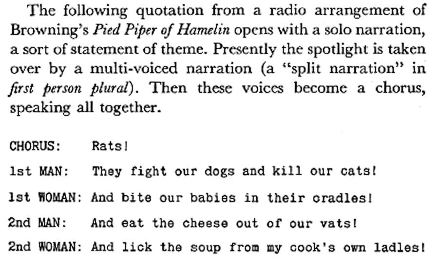 Example of choral speech from script for episode of Corwin’s 1938-39 Words Without Music, reproduced in Barnouw’s 1945 Handbook of Radio Writing