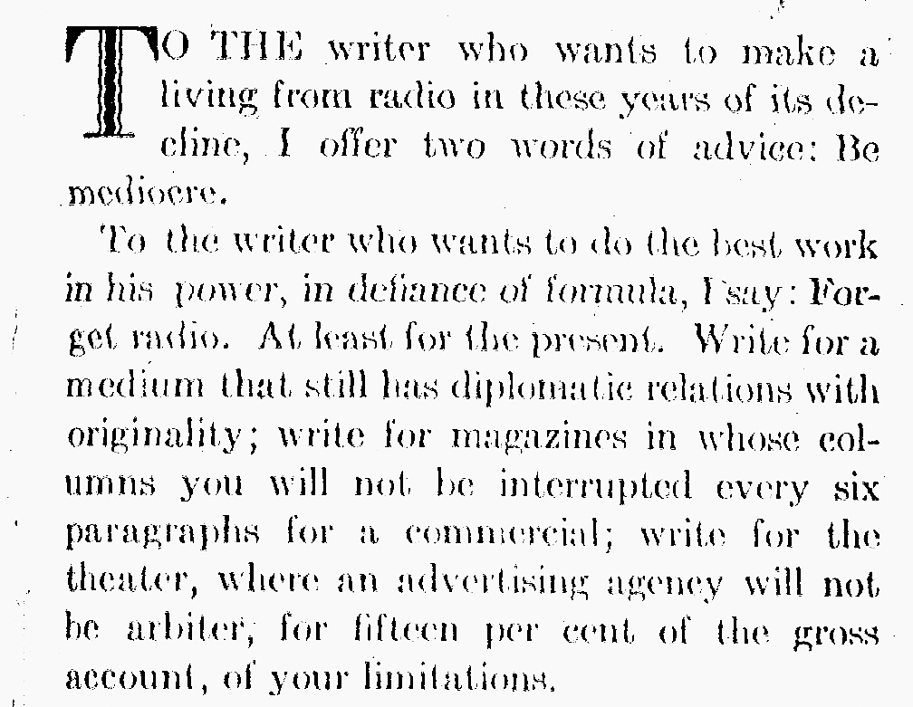 Page from 1951 essay by Corwin for The Writer, in which aspiring writers who wish to exercise their creative freedom are advised to “forget radio” and look elsewhere.