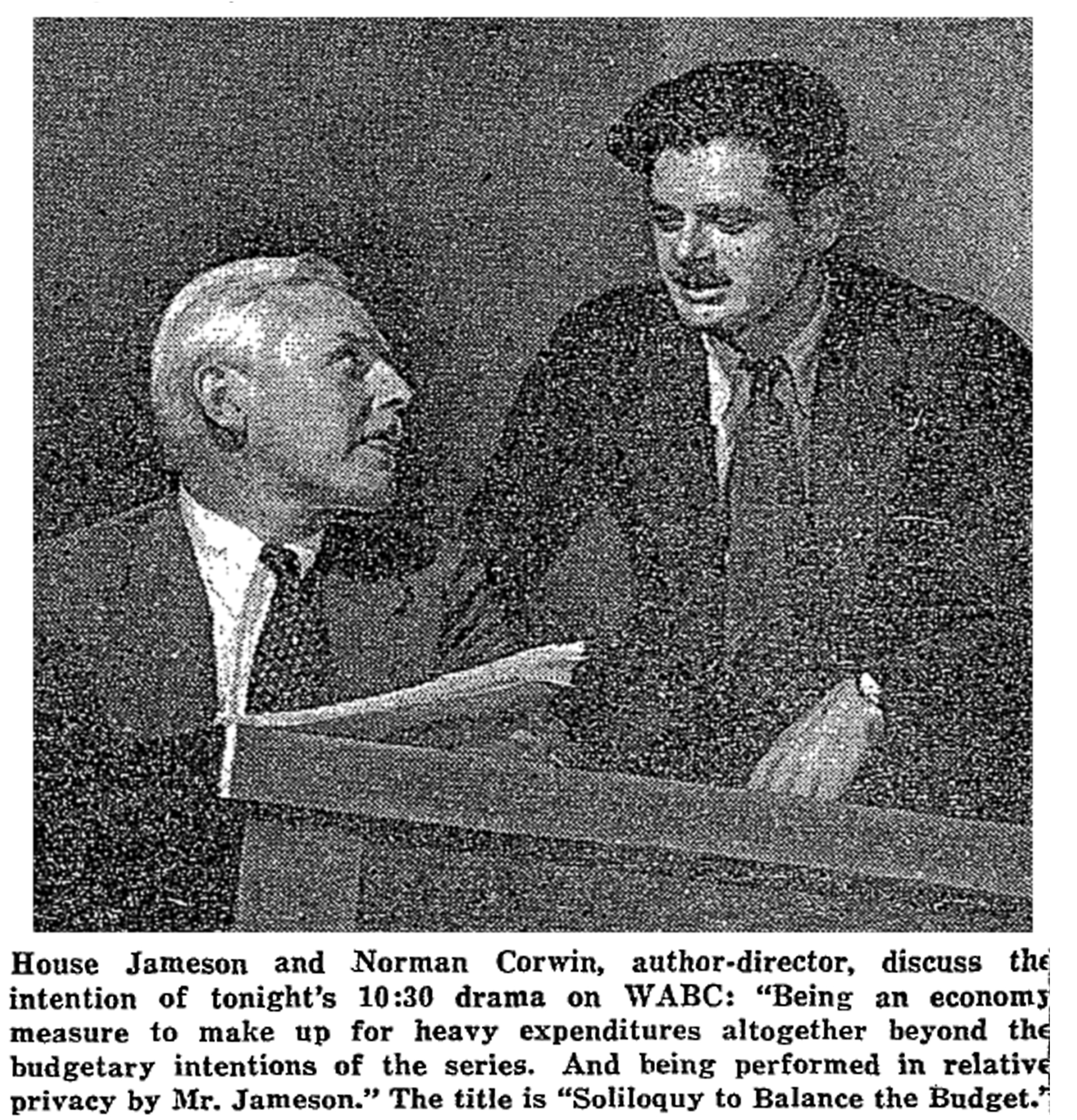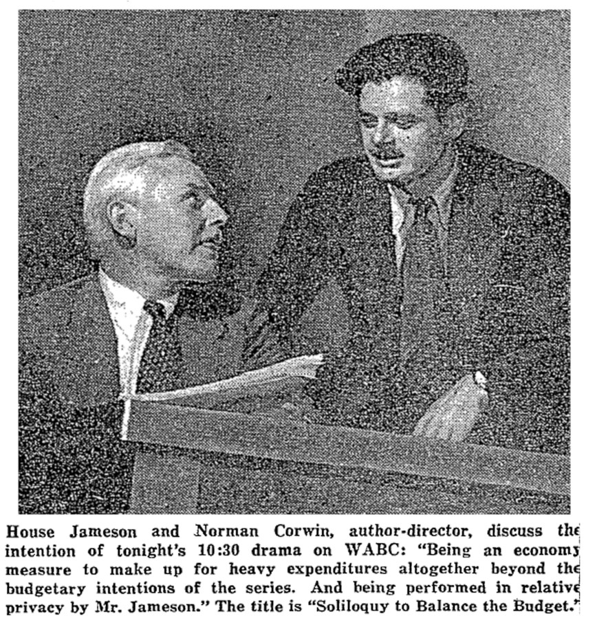 Images of a well-oiled network publicity machine at work. Newspapers such as the New York Times frequently printed network-supplied publicity stills and promotional copy in their radio sections. Here’s a publicity still of Corwin with actor House Jameson preparing for the the “Soliloquy” episode of Twenty-Six by Corwin (6-15-41).
