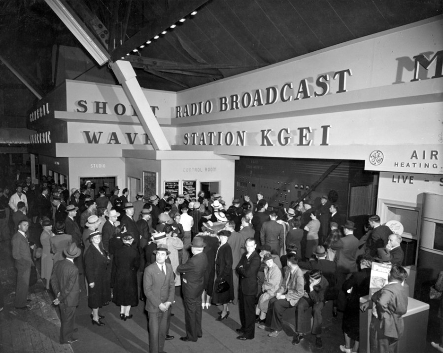 KGEI, the shortwave radio broadcasting station sponsored by General Electric at the 1939 – 1940 San Francisco Golden Gate International Exposition (World’s Fair). Shows control room, fair patrons, studios, and General Electric signage.