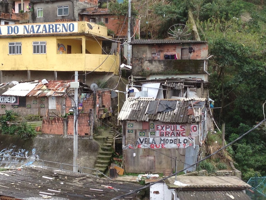 “White Evictions. favela, model of what?” Protest signs at the Santa Marta Favela