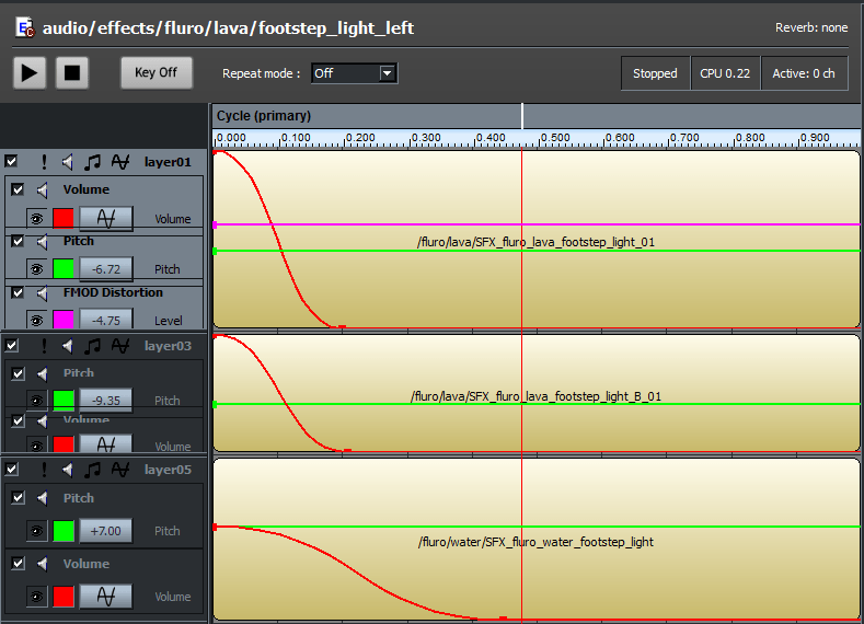 The lava fluro foosteps in FMOD Designer.