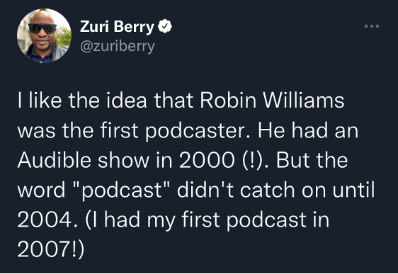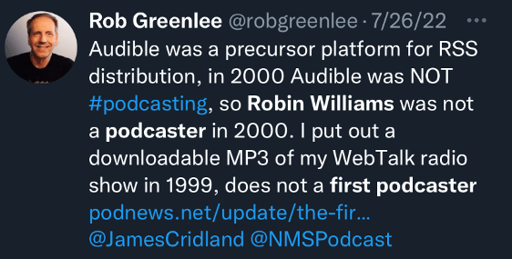 Cridland’s argument went like this: As an early investor in Audible.com, Williams launched a bi-weekly talk show called RobinWilliams@Audible in early 2000 (several months before Winer’s pioneering RSS), which listeners could download onto their mp3 players. Subscribers who owned an Audible Mobile Player could even have RobinWilliams@Audible automatically pushed to their device. “Of course, that’s what the first podcast was, too,” Cridland noted, “something you downloaded to your computer, then synched to your mp3 player.”