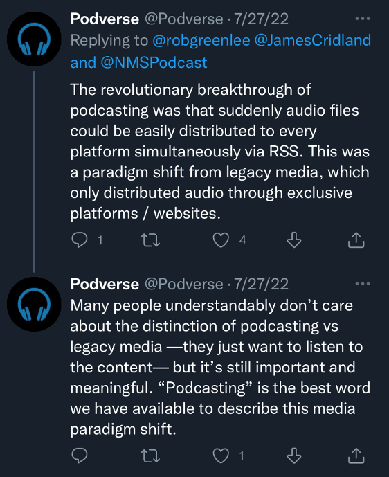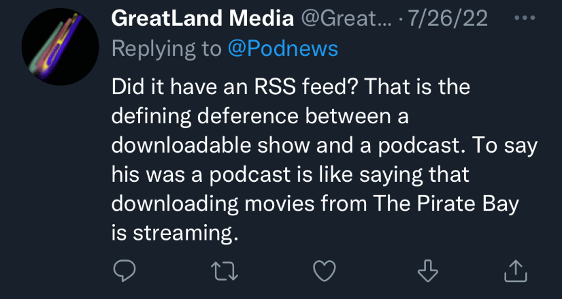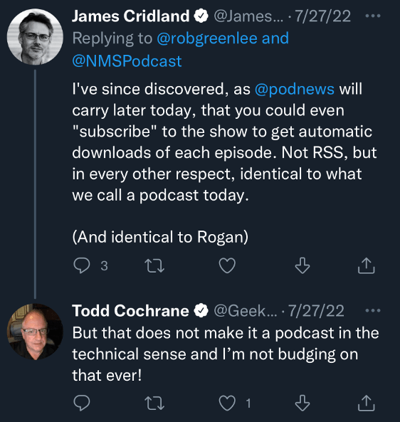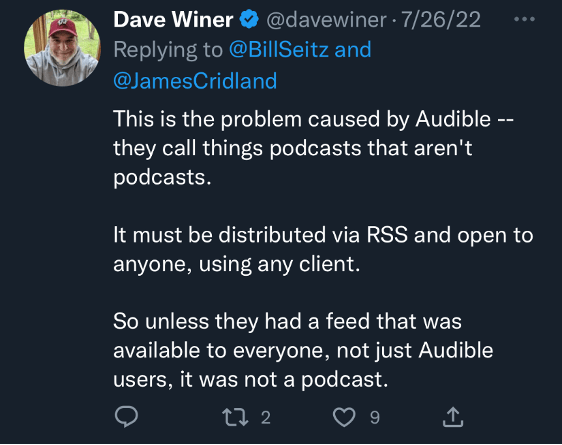 On Twitter (an ancient social media app where people used to go to eviscerate each other), Cridland’s article provoked a squall of exceptions, which generally argued that downloadable audio without RSS does not a podcast make; and though Audible’s platform may have been innovative, and even shared some characteristics with podcasting, the fact that its programs were limited to the company’s proprietary platform meant that they were definitively not podcasts.