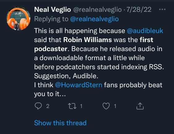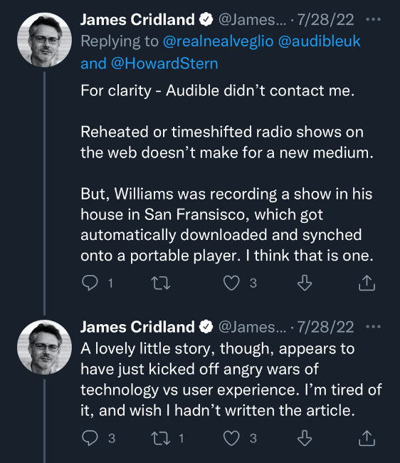 And understandable, too, is the prickly reaction to Cridland’s alternate history: To claim that RobinWilliams@Audible may have been the first podcast is to suggest that RSS – and the open and democratic values which it represents – are inessential; and more troubling, that proprietary systems are deeply rooted in the history of the medium.