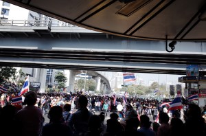 One moment was particularly chilling. The American was leading the group in a series of “what-do-we-want-when-do-we-want-it” chants, which though adapted to concerns of the anti-junta movement felt pro forma and out of place. That cadence and call-and-response pattern is almost never heard at protests in Thailand, and the protesters were not accustomed to it. When someone suggested chanting in Thai rather than English, the group naturally fell into a different rhythm. The repetition of Prayuth aawk bpai, an insulting demand that coup leader General Prayuth Chan-Ocha go away, was much sharper. The chant hearkened to protests of recent years against illegitimate Thai governments. A recording of it would, without doubt, be very risky once heard by the wrong ears in Thailand. Its potency was not only in its direct semantics, but in the connection it formed between the current protest and protests of the recent past. Protest in an age of ubiquitous media tends to form such links across boundaries of time and space.
