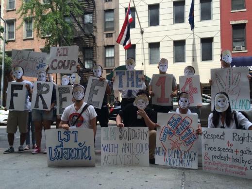 Featured image: Picture of #FreeThe14 protest in New York City this past July. From Thai Students Center for Democracy(@TSCD_EN) tweet on July 7, 2015.