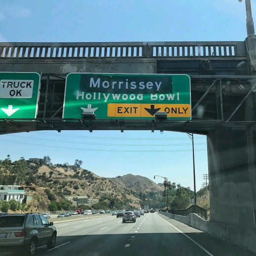 Featured Image: in August 2017, Morrissey Fans changed the offramp sign of the 101 Freeway after Moz announced his Hollywood Bowl shows. Picture credit: michaelanthonytorres on Instagram.