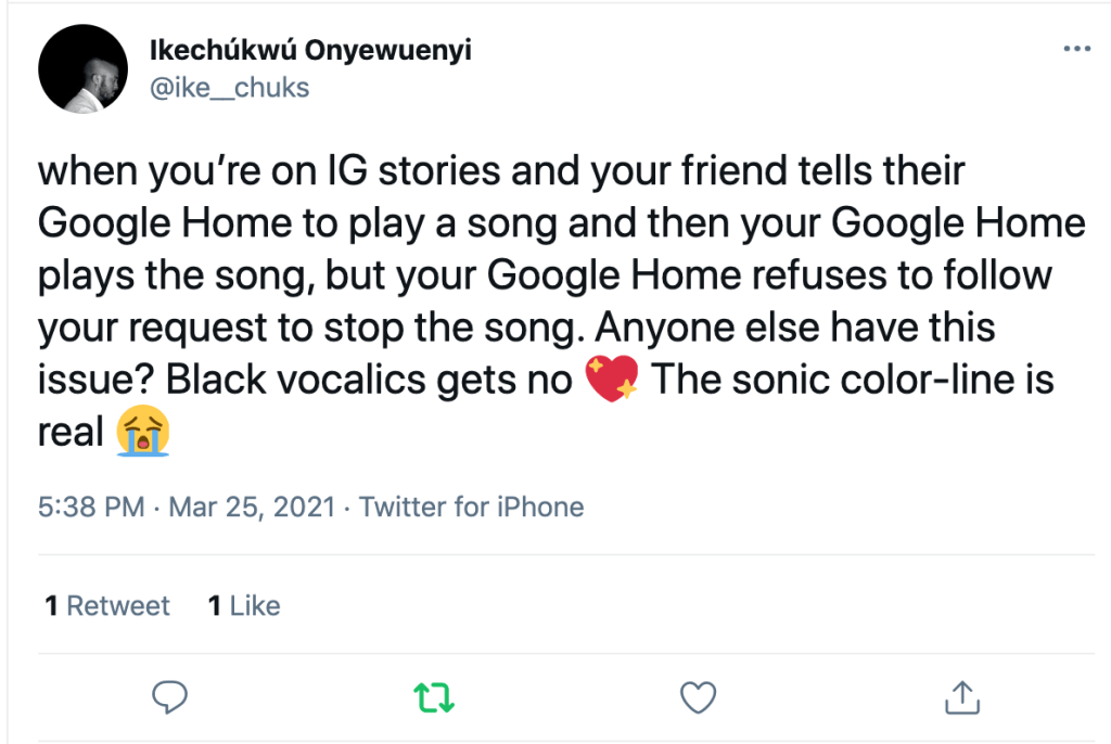This incomprehension extends to Black Americans of all ages, and to other IVAs. A study by Allison Koenecke et al. on ASR systems produced by Amazon, Google, IBM, Microsoft and Apple discovered that these entities had a harder time accurately transcribing Black speech than white speech, producing “an average word error rate (WER) of 0.35 for black speakers compared with 0.19 for white speakers.” (7684). A study by Zion Mengesha et al. on the impact of these errors on Black Americans—which included participants from different regions with a range of ages, genders, socioeconomic backgrounds and education-levels—discovered that many felt frustrated and othered by these mistakes, and felt further pressure to code-switch so that they would not be misunderstood. Koenecke et al. concluded that ASR systems could not understand the “phonological, phonetic, or prosodic characteristics of” AAVE (7687), and that this ignorance would make the use of these technologies more difficult for Black users—a sentiment that was echoed by participants in the study conducted by Mengesha et al., most of whom marked the technology as working better for white and/or SAE speakers (5).
