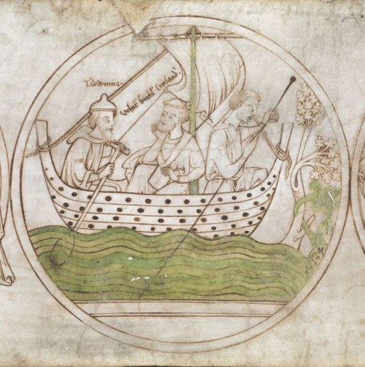 Featured Image: Guthlac sailing to Crowland with Tatwin. © British Library, Harley Roll, Y 6, roundel 4, from Medieval Histories.com