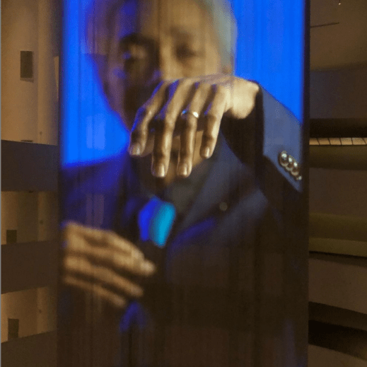 In addition to the immersive video installation on view in the rotunda, this exhibition also includes a touching companion film, titled “∞,” which visitors can access behind a luxe pleated curtain that divides the first floor side gallery from the main space. This video is a short interview that Tsang shot during the filming of Anthem of Glenn-Copeland and his partner, Elizabeth Glenn-Copeland, a theater artist, storyteller, and arts educator.