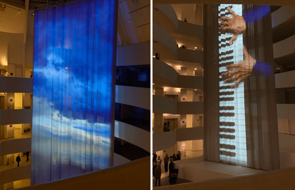 Harnessing the generous sound-reflecting quality of the Guggenheim’s concrete walls, Anthem weaves Glenn-Copeland’s voice and body percussion into a larger tapestry of other voices and sounds placed along the museum’s circular ramp, building a soundscape that wraps around the space. When I asked the exhibition’s curator X Zhu-Nowell about the striking ethereal, translucent quality of the curtain sculpture, X remarked,