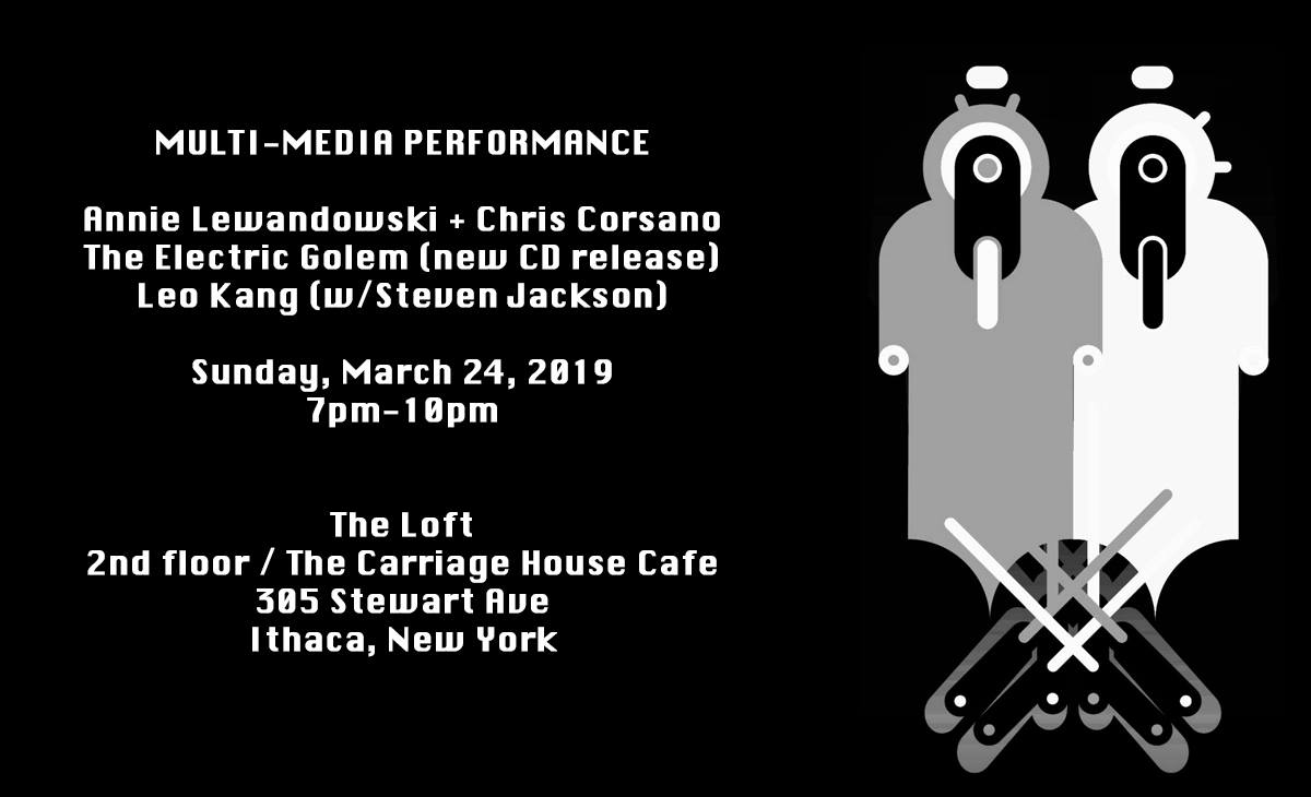 On March 24th, 2019 the record release party for The Electric Golem’s 6th CD Golemology was held at the Loft in Ithaca, New York. The Electric Golem is an avant-garde synthesizer duo featuring Trevor Pinch and James Spitznagel, that has been in existence for about ten years.