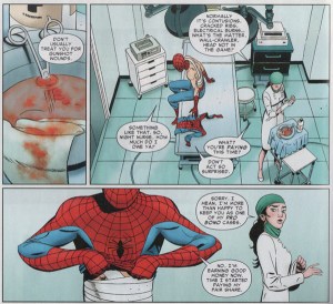 For example, in the second panel below, despite the static image, the passage of time suggested by the conversation about Spider-man’s wounds and payment leads the reader to make sense of the sequence between it and the panel that follows. It is the reader’s understanding that it takes time to talk and listen out loud that helps make the time of the panel apparent.