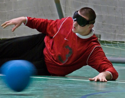 All goalball players are blind or low vison and wear blackout eyeshades to equalize the playing field and to ensure that any residual vision doesn’t get in the way of the gameplay’s sound. A pre-game equipment check includes referees ensuring that eyeshades don’t let in any light. Penalties include touching one’s eyeshades or making noises that disrupt the other team’s ability to hear the movement of the ball.