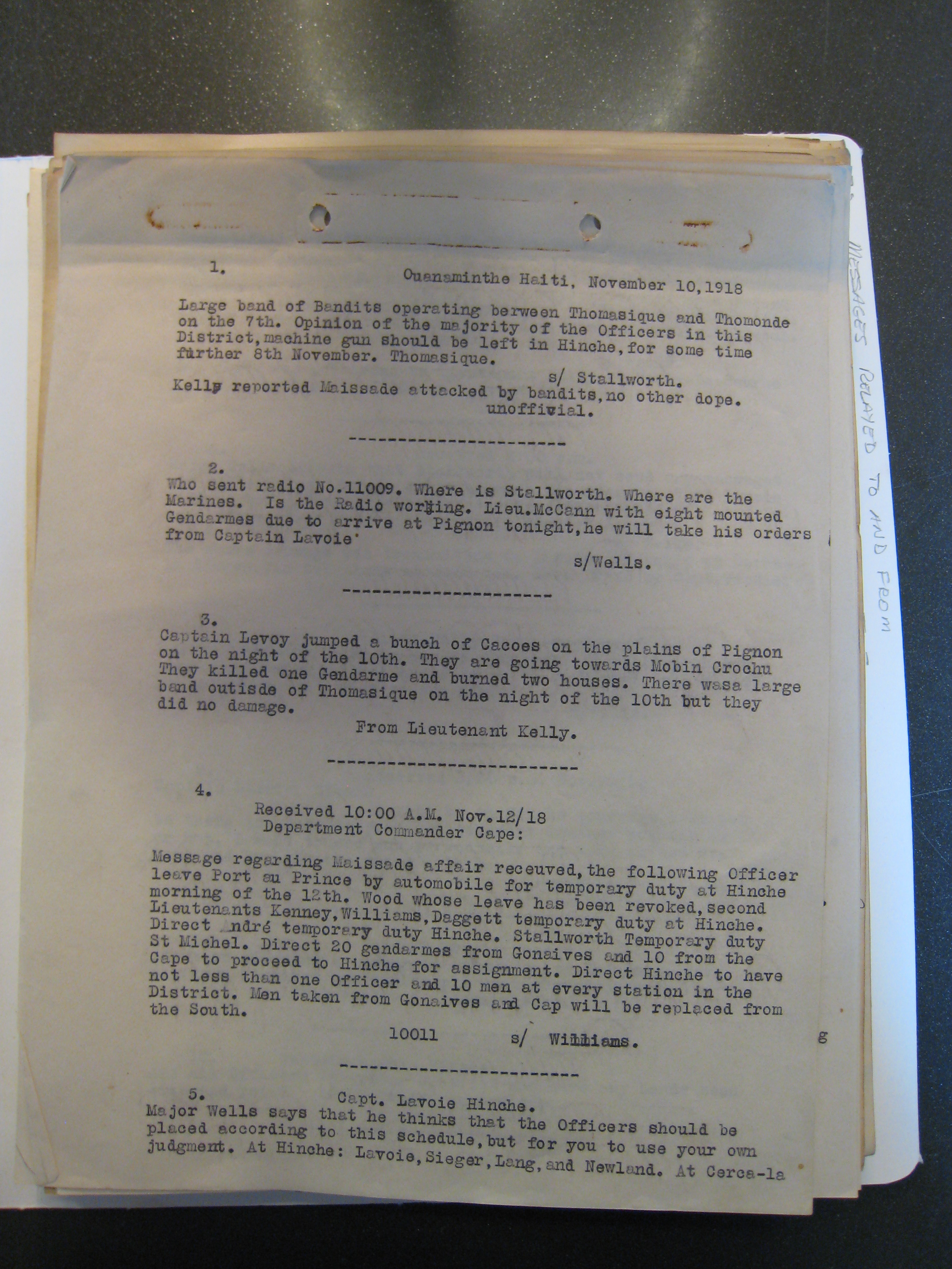 “Messages relayed to and from Cap Haitien via Ouanaminthe”, Entry 173 Chief of the Gendarmerie D’ Haiti, General Correspondence 1919-1920, Operations against hostile bandits, RD 127, United States National Archives