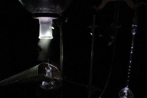 To fully realize this liquid dream, we went to great lengths in order to fuse the messy behaviour of matter flowing throughout the installation with meticulously correlated and localized sonic behaviour. For example, the temporal texture of boiling liquid in one chamber is perceptually inseparable from the spectral entropy of simmering voices which then evaporate into a cloud of spectral mist. All of this dynamic activity is finely localized: the sounds acoustically emit exactly from where the action occurs, rather than spatially schizophying loudspeakers elsewhere.