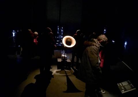 For example, at some point we decided to gather sonic vapour in a glass dome and condense it back into drops, which were then guided to fall into the bottom of the installation. The purified drop of voice—sonic “lapis philosophorum”—was to fall into the depths of the earth beneath and shine upward like sonic gold, connecting heaven and earth. We had to execute this opus magnum inside a very small hole in the base of the installation. The water drop needed to be immediately sensed and sonified, leading to sounds coming out of the same hole, along with synchronized light. You can imagine that if we were relying on “black-boxed” technologies and ready-made techniques then this task would have seemed like a nightmare to design and fabricate. The water drop was to fall all the way to the bottom of the hole where it would be acoustically sensed by a small apparatus that had to be acoustically isolated from everything else. Then the result of the sonification had to be pushed through the very same hole with a high degree of intelligibility and in a way that it would be seamlessly localized. Meanwhile, light had to shine through this hole in sync with the sounds but the source of light had to remain hidden.
