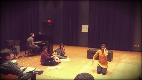 Rehearsing for “Meena’s Dream” (2013) by playwright Anu Yadav – original score by Rajna and Anjna Swaminathan and Sam McCormally.