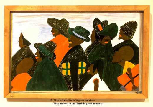 Panel 35 of Jacob Lawrence’s Migration Series, documenting Black Americans’ move to Northern Urban Centers : “They Left the South in Great Numbers. They Arrived in the North in Great Numbers.” Photo by Flickr User Ron Cogswell, (CC BY-NC 2.0)