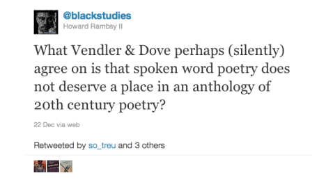 But despite the debate putting poetry front and center and enacting ways that it matters, Vendler’s critique and Dove’s response are each conservative, though in quite different ways. Neither Vendler nor Dove in the review, anthology, and defense of the anthology imagines the inclusion of spoken word, hip-hop (see Howard Rambsy II), and other forms of contemporary rhyme and verse that speak to a broad range of audiences across race, sex, and class. The inclusion of rap might further change the tenor of the conversation, opening up in important ways the debate over what counts as poetry, and expanding how black musical and poetic forms are heard and by whom.