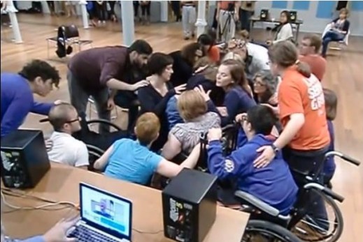 In his work on the AUMI, KU alumni and sound studies scholar Pete Williams explains how the wide range of mobility typically encouraged in what he calls “standard practice” across theatre, music, and dance is challenged by the AUMI’s tendency to inspire “smaller” movements from performers. While he sees in this affective/physical shift the opportunity for able-bodied performers to encounter “…an embodied understanding of the experience of someone with limited mobility,” my work here focuses less on the software’s potential for able-bodied performers to empathize with “limited” mobility and more on the atypical forms of social interaction and communication the AUMI seems to evoke in mixed-ability settings. An attempt to frame this technology as a disability simulator not only demarcates a troubling departure from its original, intended use by children with severe physical disabilities, but also constitutes a prioritization of able-bodied curiosity that contradicts what I’ve witnessed during mixed-ability AUMI jam sessions in Lawrence.